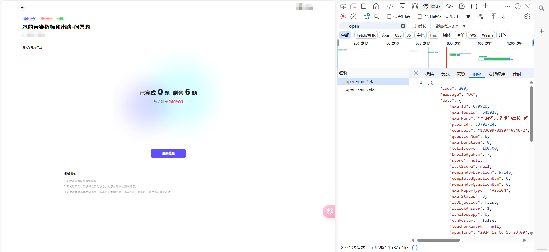 examTestId、courseId、examName、paperId、classId均可通过开发者模式抓包进入答题的前置页面获取,而通过参数构造链接即可查看对应的作答情况。